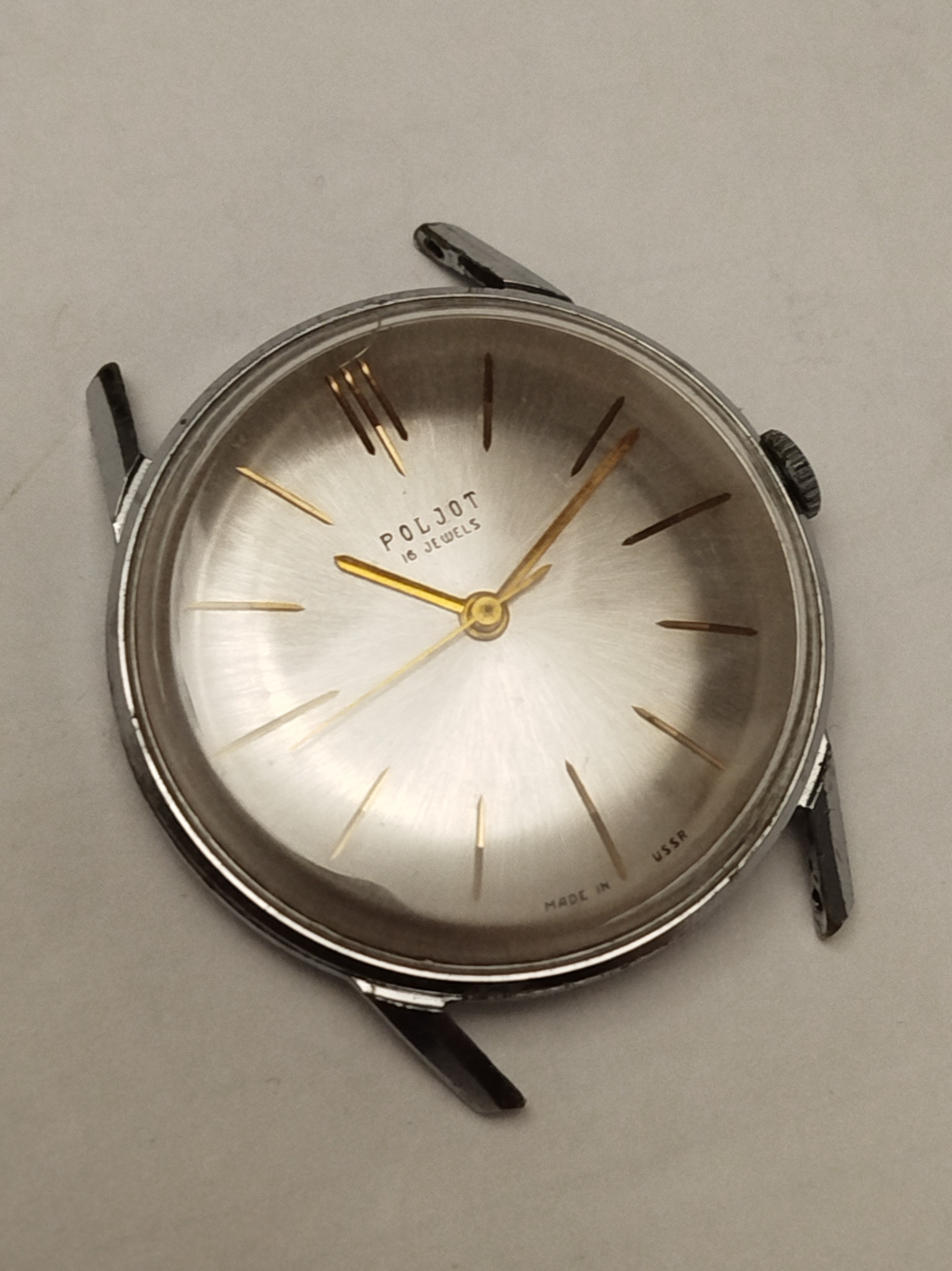 - Dial: Sunburst silver/champagne dial with gold hands and markers. Hour scale with milled markings of a goldish hue. Dial signed Poljot, 16 jewels and Made in USSR