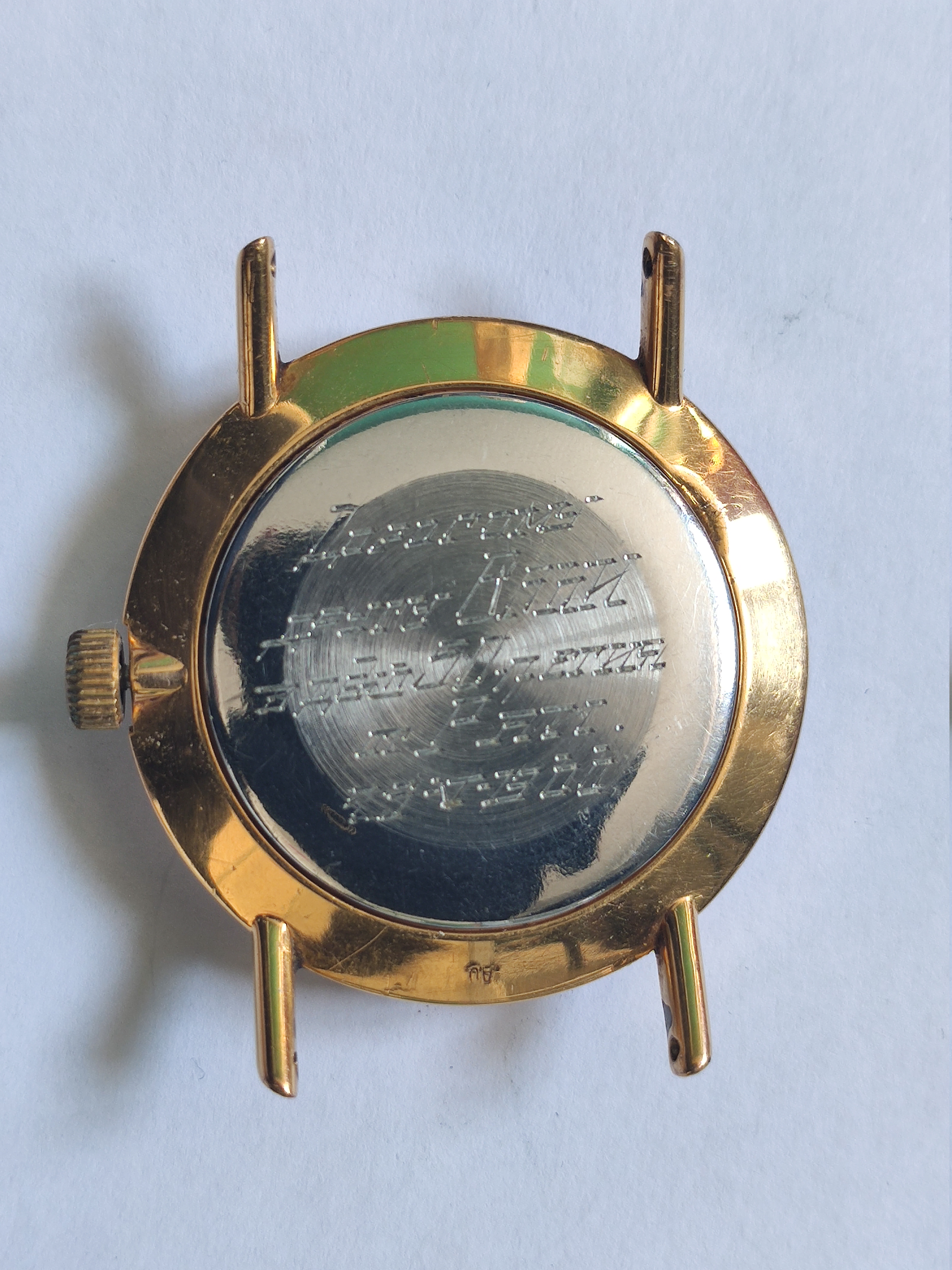 - Dial: Sunburst silver/champagne dial with gold hands and markers. Hour scale with milled markings of a goldish hue for 3,6,9,12, black lines for others. Dial signed ракета, logo of Petrodvorets watch factory and "сделано в ссср"