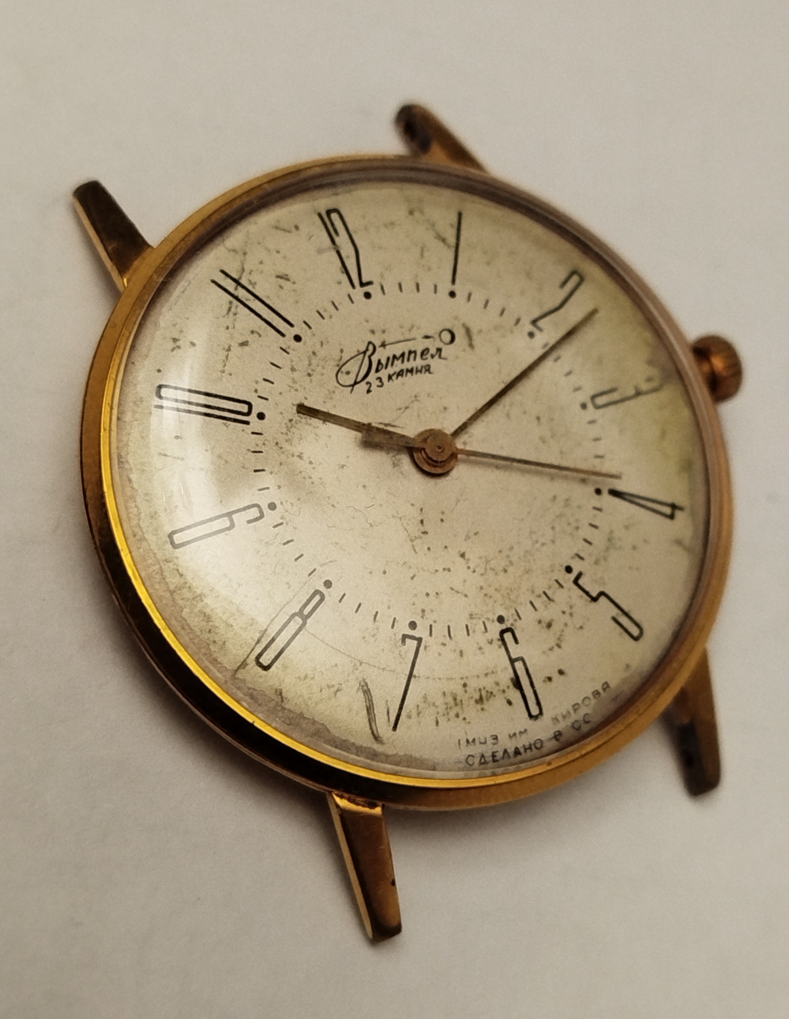 - Dial: White dial with gold hands. Hour scale with Arabic art deco numerals. Dial signed in cyrillic with Vympel with sputnik logo, 23 камня, 1 MChZ im Кирова and "сделано в ссср"