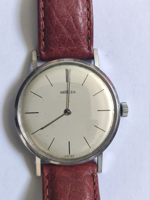 - Dial: original white dial with painted hour markers and chrome hands. Dial signed Angelus, Swiss.