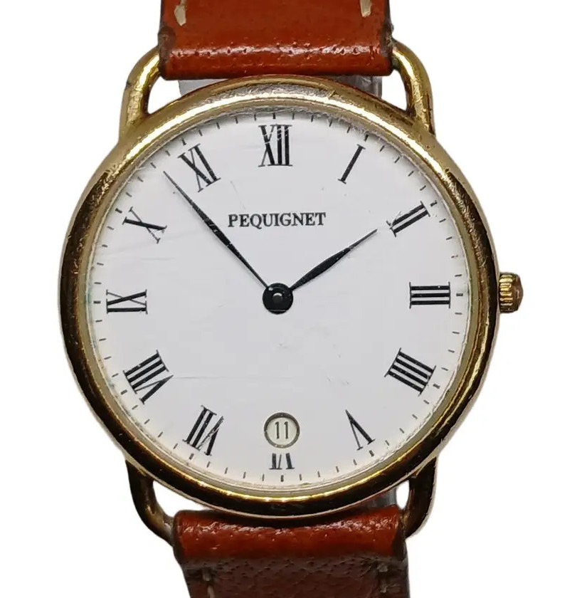 - Dial: White dial with Roman painted numerals. Black leafed shape hands. Date at 6. Dial signed Pequignet, Quartz, Swiss