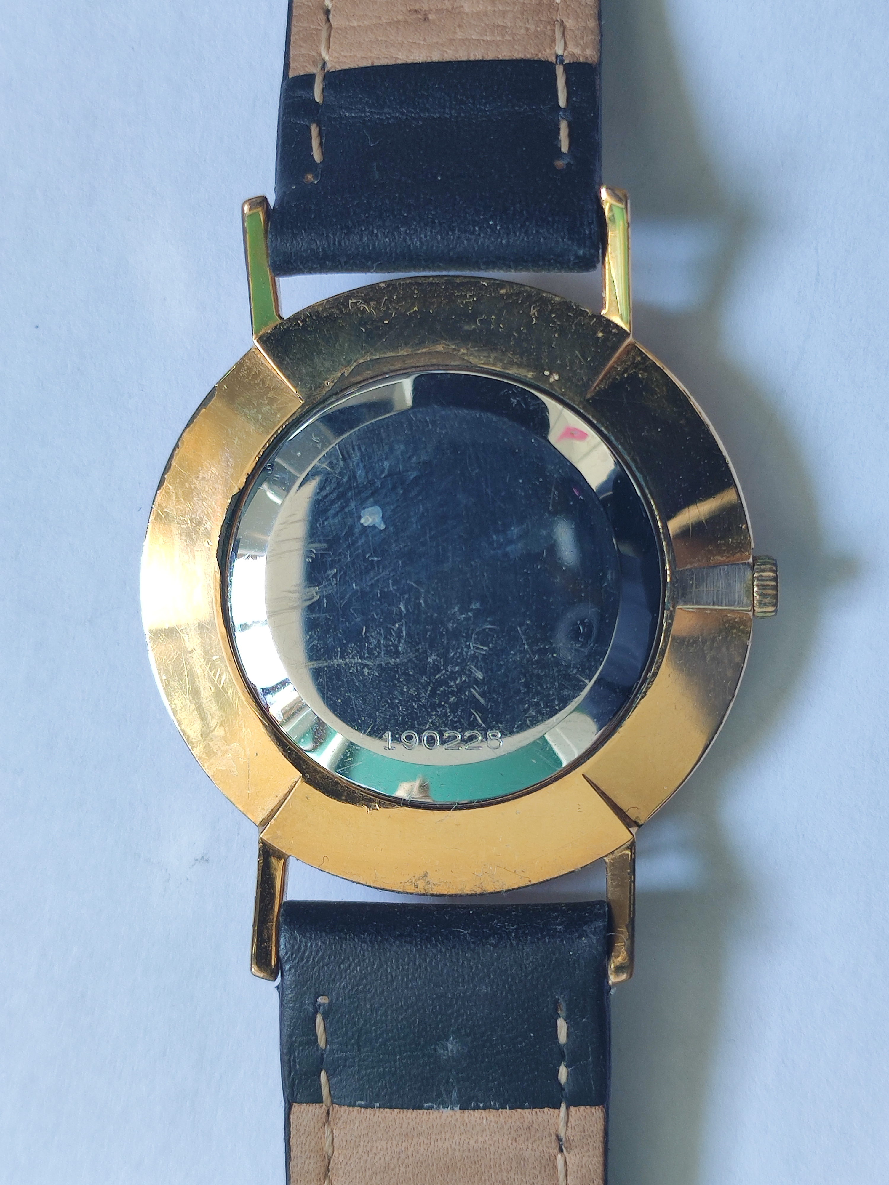 - Dial: original silver sunburst dial with black lines, gold hour markers and matching hands. Dial signed Sarcar, Genève, 17 rubis, incabloc, and swiss made.