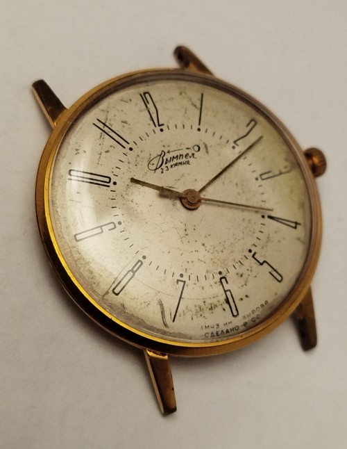 - Dial: White dial with gold hands. Hour scale with Arabic art deco numerals. Dial signed in cyrillic with Vympel with sputnik logo, 23 камня, 1 MChZ im Кирова and "сделано в ссср"