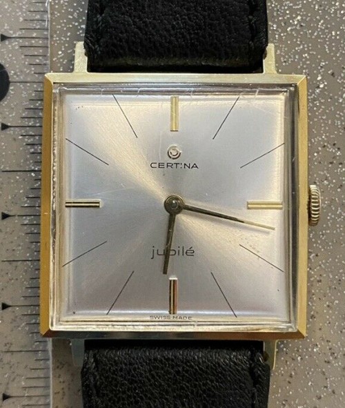 - Dial: Sunburst silver/champagne dial with gold hands and markers. Dial signed Certina (with embossed logo), Jubilé, swiss