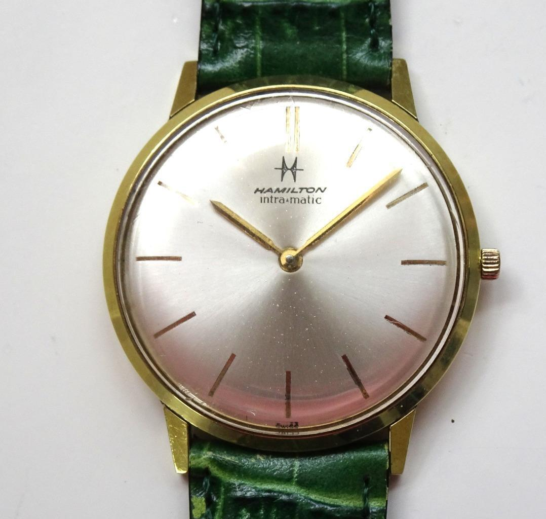 - Dial: Sunburst silver/champagne dial with gold hands and markers. Dial signed Hamilton (with logo), intra-matic, swiss. Former repainted Buren dial?