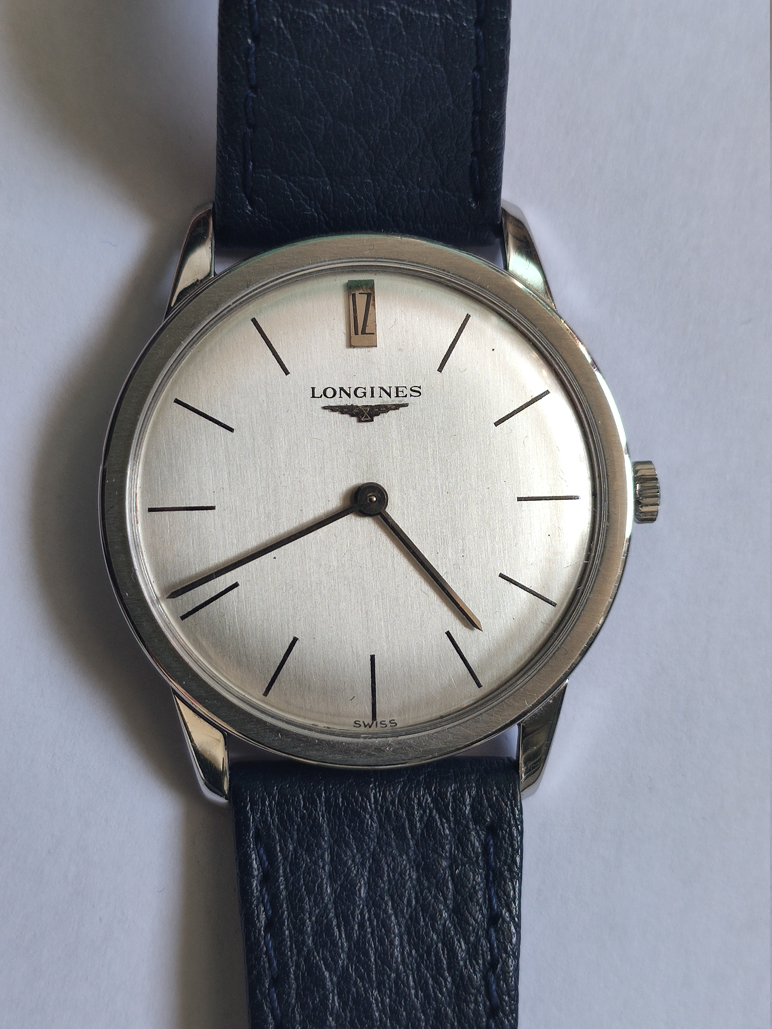 - Dial: original silver dial with black markers and chrome hands. Dial signed Longines, Swiss and with metal longines logo and 12 o'clock marker.