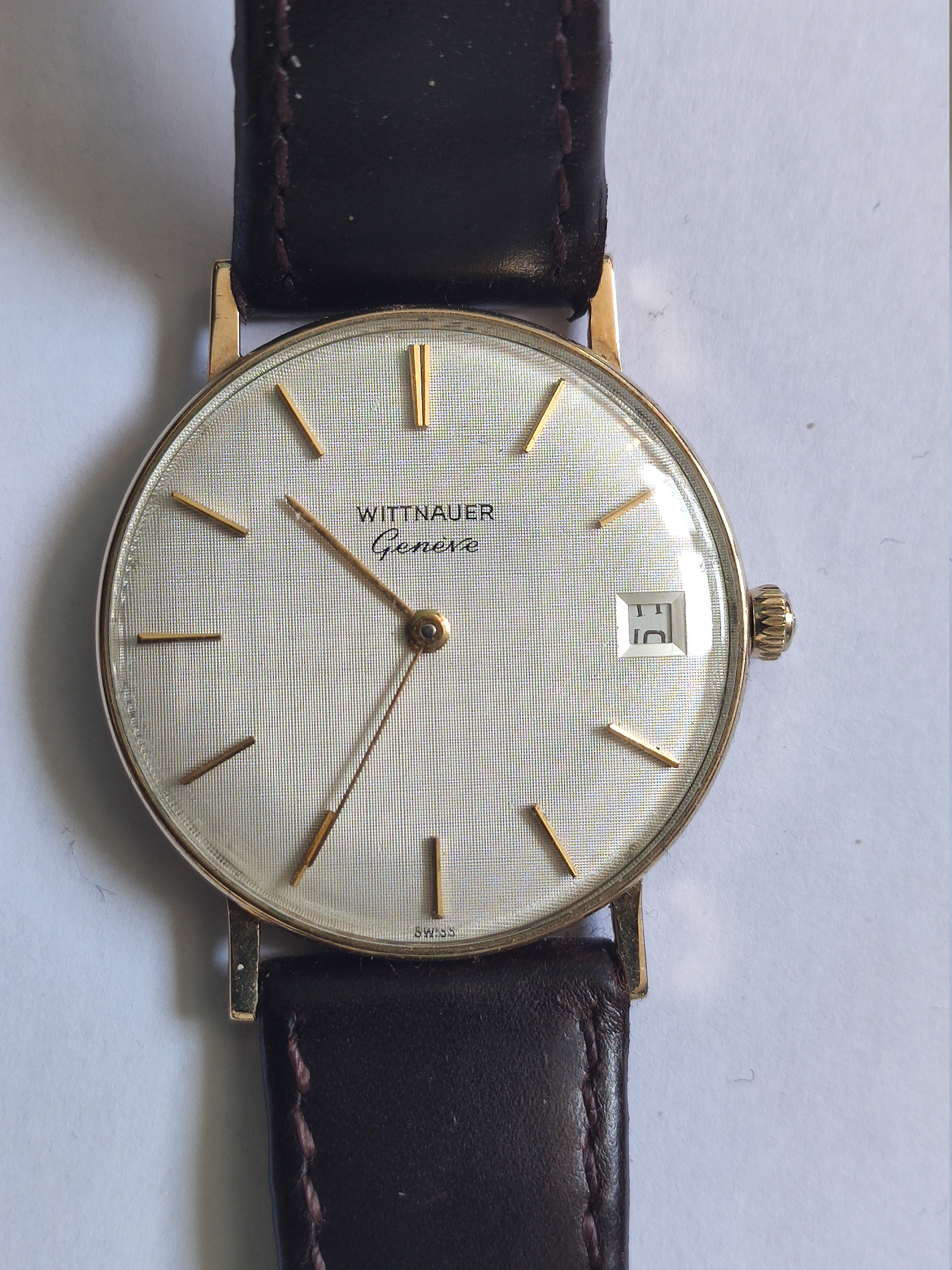 - Dial: original white linen dial with gold hour markers and matching hands. Date box. Dial signed Wittnauer, Genève and Swiss